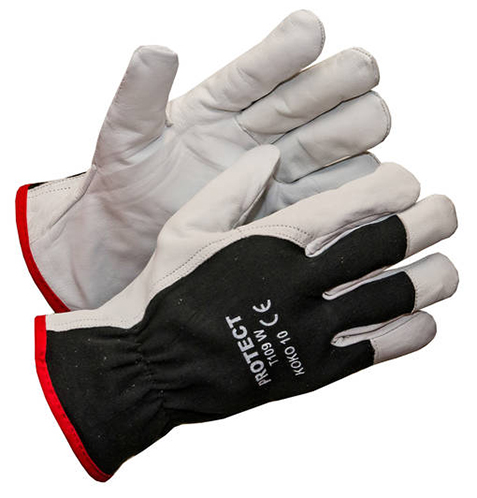 Asentajan työsormikas, erittäin kestävä vuohennahkakämmen, joustava puuvillakangasselkä, lämmin fleecevuori. Peukalo, etusormi sekä sormenpäät vahvistettu. Koot: 9-11. 12 paria nipussa, 120 paria laatikossa.