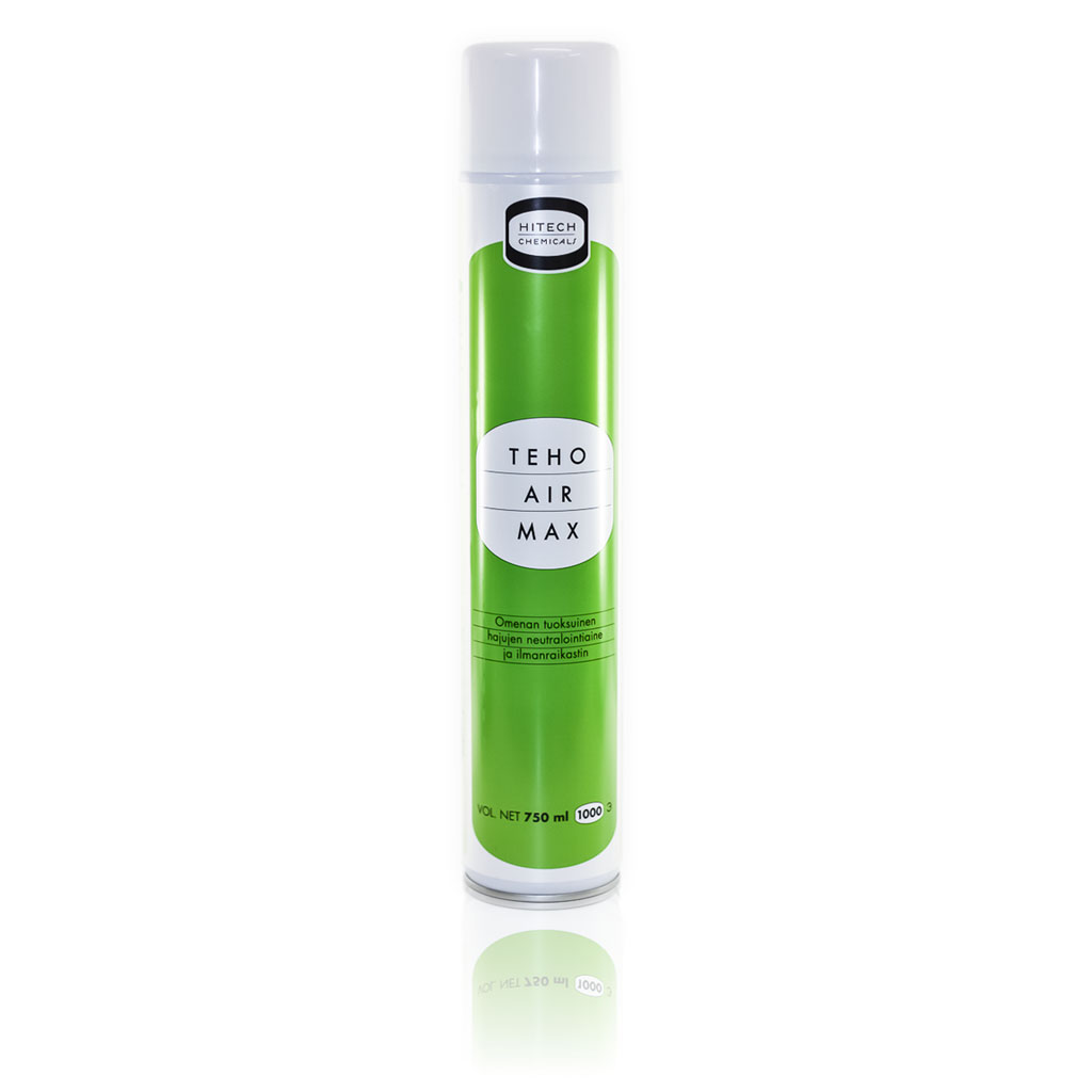 TEHO Air Max on hajujen neutralointiaine ja ilmanraikastin, joka neutraloi ja sitoo epämiellyttävät hajut. Tuotteen raikas tuoksu raikastaa ilman välittömästi pahoista hajuista, ja samanaikaisesti sen sisältämät molekyylit tekevät työtään ja neutraloivat hajujen aiheuttajat. Aerosolipullossa on tehosuutin, joka levittää tuotetta lyhyelläkin painalluksella laajalle alueelle.